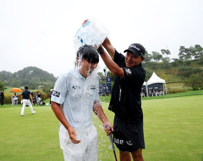 우승 후 물세례를 받는 옥태훈(왼쪽). 사진=KPGA