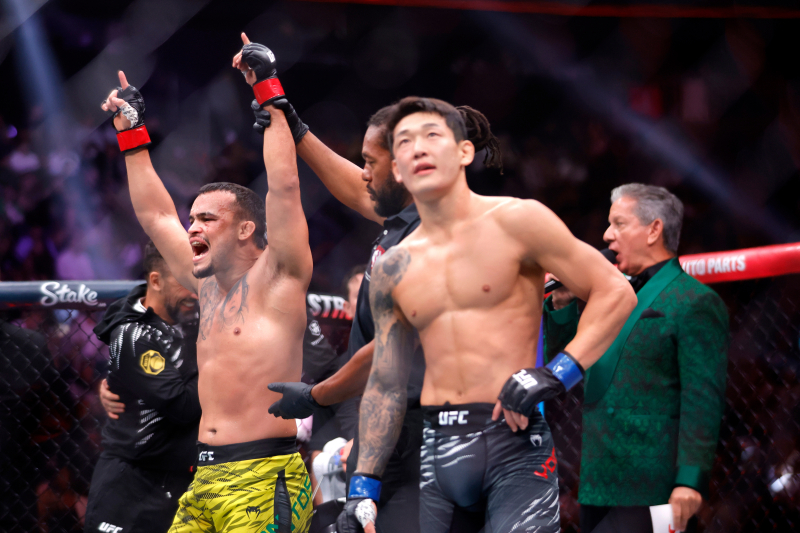 Daniel Santos, left, of Brazil, celebrates after defeating JooSang Yoo, of Korea, in a catchweight (153 lb.) bout during UFC 320 Saturday, Oct. 4, 2025, in Las Vegas. Santos defeated Yoo with a second-round TKO. (Steve Marcus/Las Vegas Sun via AP) MANDATORY CREDIT; LAS VEGAS REVIEW-JOURNAL OUT/2025-10-05 11:09:21/ <저작권자 ⓒ 1980-2025 ㈜연합뉴스. 무단 전재 재배포 금지, AI 학습 및 활용 금지> 유주상은 경기 뒤 자신의 소셜미디어(SNS)를 통해 “죄송합니다. 시원하게 졌네요.”라는 짤막한 소감을 전했다.