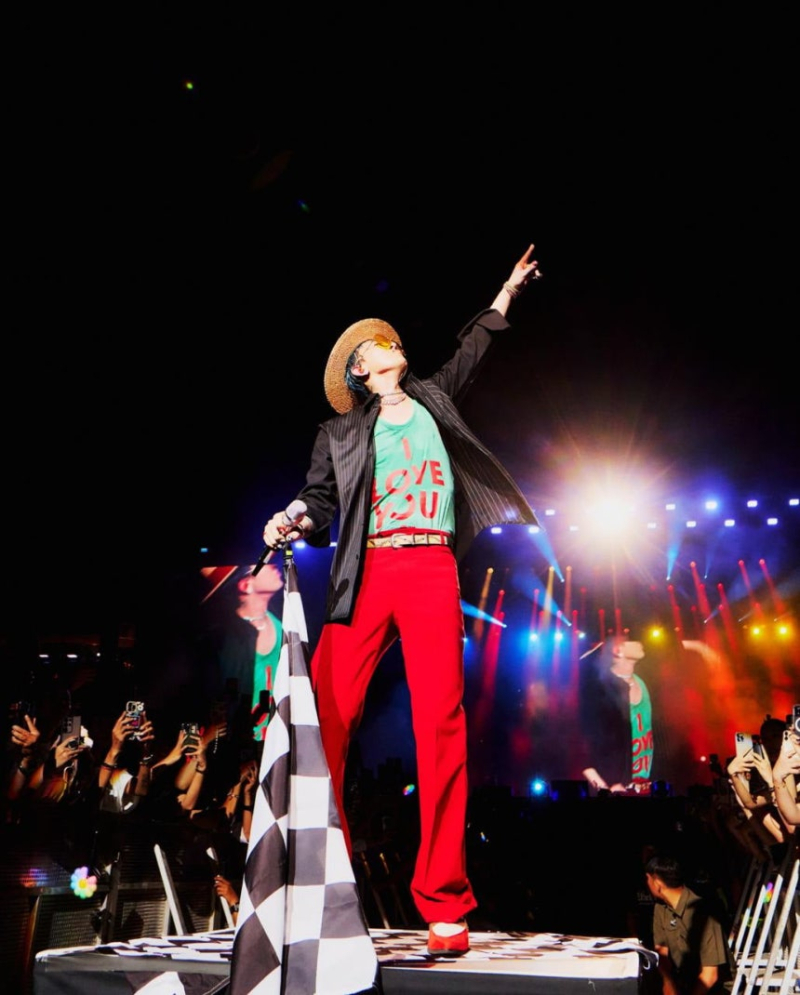 사진제공=갤럭시코퍼레이션 지드래곤은 F1과 어울리는 무대 의상도 선보이며 시선을 사로 잡았다. 첫 번째 무대에선 ‘위버멘쉬’ 로고와 다채로운 패치가 장식된 레이싱 자켓에 레더 팬츠와 부츠를 매치해 강렬한 카리스마를 발산했다. 이어 두 번째 무대에서는 레드 슈트를 소화했고, 마지막 무대에선 F1의 상징인 체크무늬 깃발을 연상시키는 의상으로 눈길을 모았다.