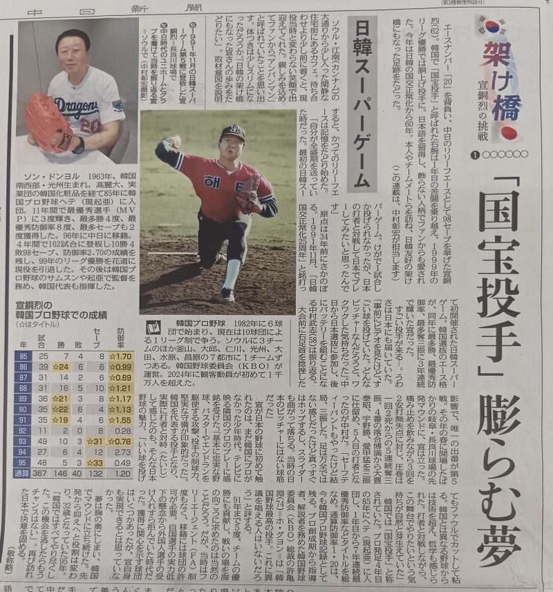 일본의 유력 일간지 주니치신문(中日新聞)은 한일 수교 60주년을 돌아보는 시리즈를 연재하고 있습니다. 스포츠 분야에서는 선동열 전 야구대표팀 감독이 스토리텔러입니다.