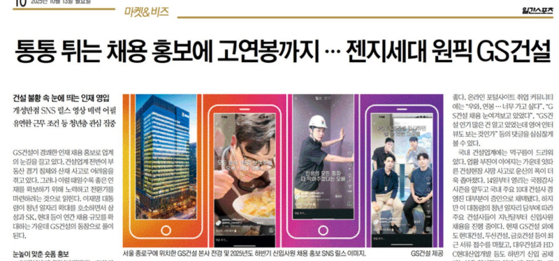 GS건설이 경쾌한 인재 채용 홍보로 업계의 눈길을 끌고 있다. 건설업계 전반이 부동산 경기 침체와 산재 사고로 어려움을 겪고 있다. 그러나 이럴 때일수록 좋은 인재를 확보하기 위해 노력하고 전환기를 마련하려는 것으로 읽힌다. 이재명 대통령이 청년 일자리 확대를 호소하면서 삼성과 SK, 현대 등이 연간 채용 규모를 확대하는 가운데 GS건설의 동참으로 풀이된다.