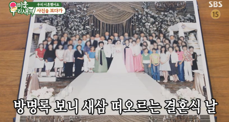 김민지 씨는 “내가 갖고 있을게”라며 “방명록은 갖고 있어야지”라고 했다. 윤민수는 “연락이 되는 분들이 없는 거 같다”고 하자 김민지 씨는 쿨하게 “20년 전인데”라고 반응했다. 사진=SBS 캡처 빼곡한 하객들과의 단체사진을 바라보던 윤민수는 “내가 갖고 있어야겠다”며 앨범을 챙겼다.