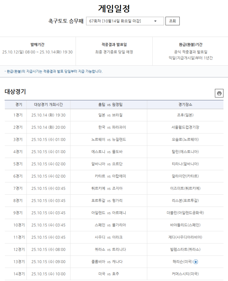 오는 10월 14일 오후 7시 30분까지 구매가 가능한 축구토토 승무패 67회차는 한국-파라과이(2경기), 일본-브라질(1경기)전 등 A매치 빅매치를 비롯해 스페인-불가리아(10경기), 포르투갈-헝가리(8경기), 미국-호주(14경기) 등 세계 각국 주요 대표팀 경기들이 예정돼 있다.
