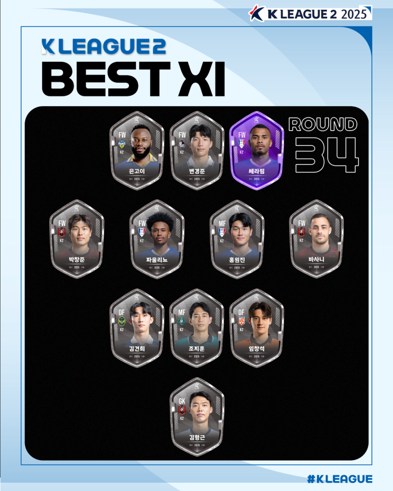 프로축구연맹은 14일 하나은행 K리그2 2025 34라운드 최우수선수(MVP)와 베스트팀을 발표했다.