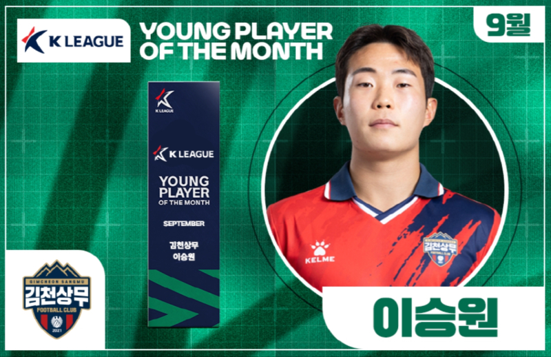 김천상무 미드필더 이승원이 9월 K리그 ‘이달의 영플레이어 상’을 수상하며 두 달 연속 K리그1 최고의 영플레이어로 우뚝 섰다. ‘이달의 영플레이어 상’ 두 달 연속 수상은 2023시즌 양현준(당시 강원), 2024시즌 양민혁(당시 강원)에 이어 역대 세 번째 기록이다.