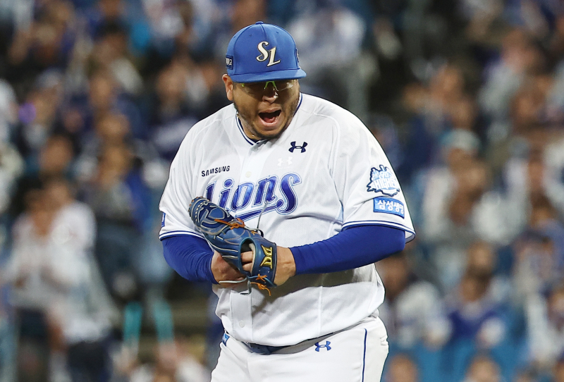 14일 대구 삼성라이온즈파크에서 열린 2025 KBO 프로야구 포스트시즌 준플레이오프 4차전 SSG 랜더스와 삼성 라이온즈의 경기. 7회초까지 무실점으로 틀어막은 삼성 선발 투수 후라도가 기뻐하고 있다. 2025.10.14 [연합뉴스]