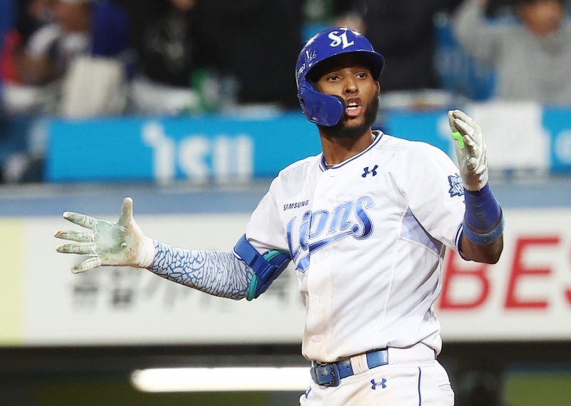 14일 대구 삼성라이온즈파크에서 열린 2025 KBO 프로야구 포스트시즌 준플레이오프 4차전 SSG 랜더스와 삼성 라이온즈의 경기. 8회말 2사 1루 삼성 디아즈가 2점 홈런을 치고 더그아웃을 바라보고 있다. 2025.10.14 [연합뉴스]