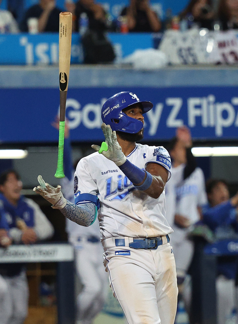 14일 대구 삼성라이온즈파크에서 열린 2025 프로야구 KBO리그 포스트시즌 준플레이오프 4차전 SSG 랜더스와 삼성 라이온즈의 경기. 8회말 2사 주자 1루 상황에서 삼성 디아즈가 2점 홈런을 치고 있다. 2025.10.14 [연합뉴스]