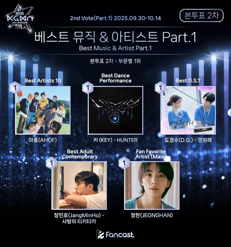 9월 30일부터 10월 14일까지 총 15일 동안 진행된 ‘2025 코리아 그랜드 뮤직 어워즈’(KGMA)의 베스트 뮤직 & 아티스트 부문(PART 1)의 본 투표 2차는 총 59만1,475표로 집계됐으며, 각 부문 1위는 다음과 같다.