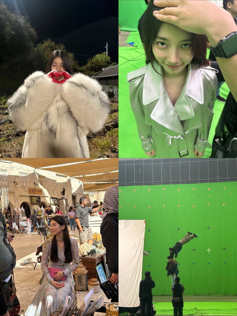 특히 아랍풍 세트장에서 찍힌 사진에서는 고풍스러운 의상과 분위기 속 수지의 우아한 자태가 돋보인다.