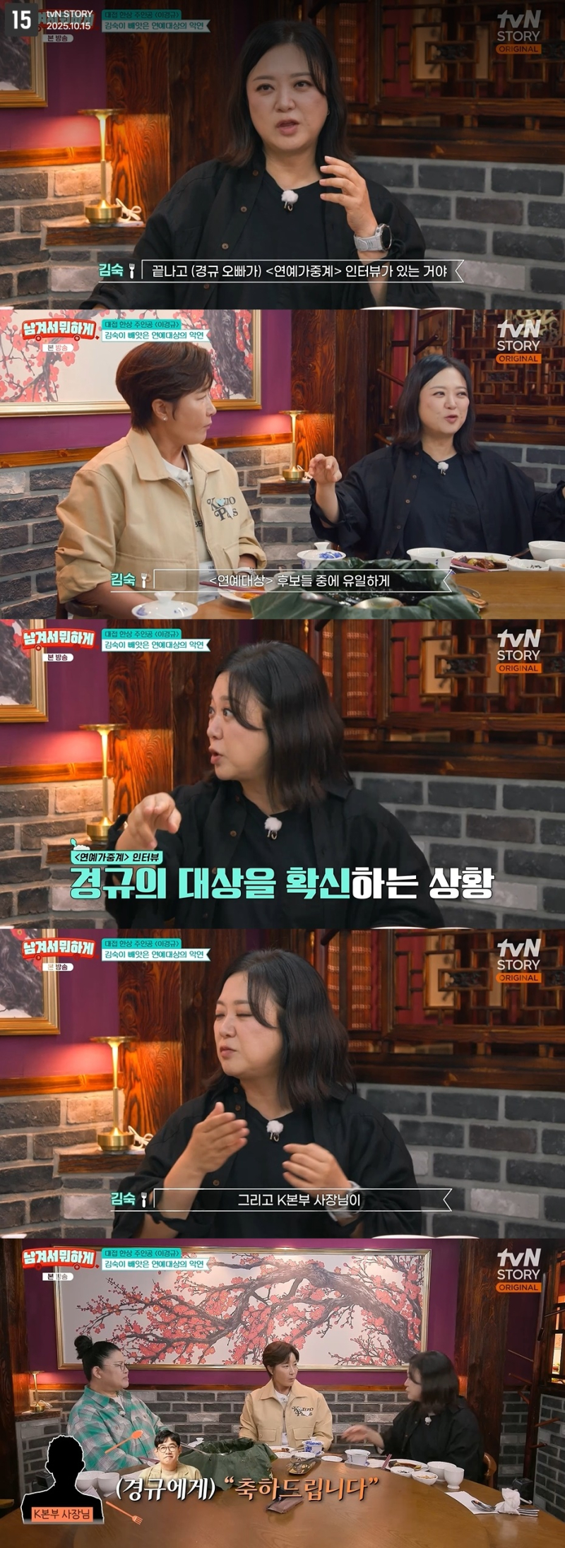 김숙은 “이경규 선배님이 ‘연예가중계’ 인터뷰가 잡혀 있어서 다들 당연히 선배님이 대상을 받는 줄 알았다”며 “게다가 KBS 사장님이 무대로 올라가면서 ‘(이경규 선배님께) 축하드립니다’라고 하셔서 나도 그렇게 생각했다”고 말했다.