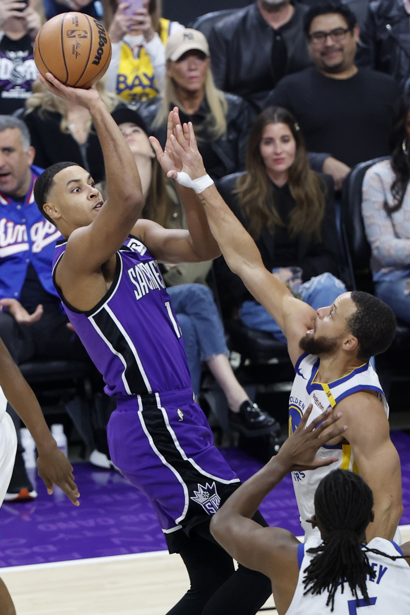 Sacramento Kings forward Keegan Murray, right, shoots in front of Portland Trail Blazers guard Shaedon Sharpe, left, during the first half of an NBA basketball preseason game in Portland, Ore., Friday, Oct. 10, 2025. (AP Photo/Craig Mitchelldyer)/2025-10-11 12:20:06/ <저작권자 ⓒ 1980-2025 ㈜연합뉴스. 무단 전재 재배포 금지, AI 학습 및 활용 금지>