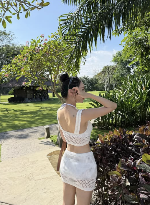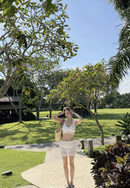 공개된 사진 속 은지는 발리의 한 리조트 정원을 배경으로 화이트 컬러의 크로셰 비키니 톱과 미니스커트를 매치, 청량하면서도 사랑스러운 매력을 뽐냈다. 사진=브브걸 은지 SNS 햇살에 비친 은지의 맑은 피부와 매끄러운 어깨 라인이 눈길을 끈다. 자연광 아래에서도 군살 없는 몸매와 당당한 포즈로 완벽한 ‘핫 썸머 비주얼’을 완성했다. 머리 위에 올린 선글라스와 내추럴한 업스타일 헤어는 세련된 휴양지 무드를 더했다.
