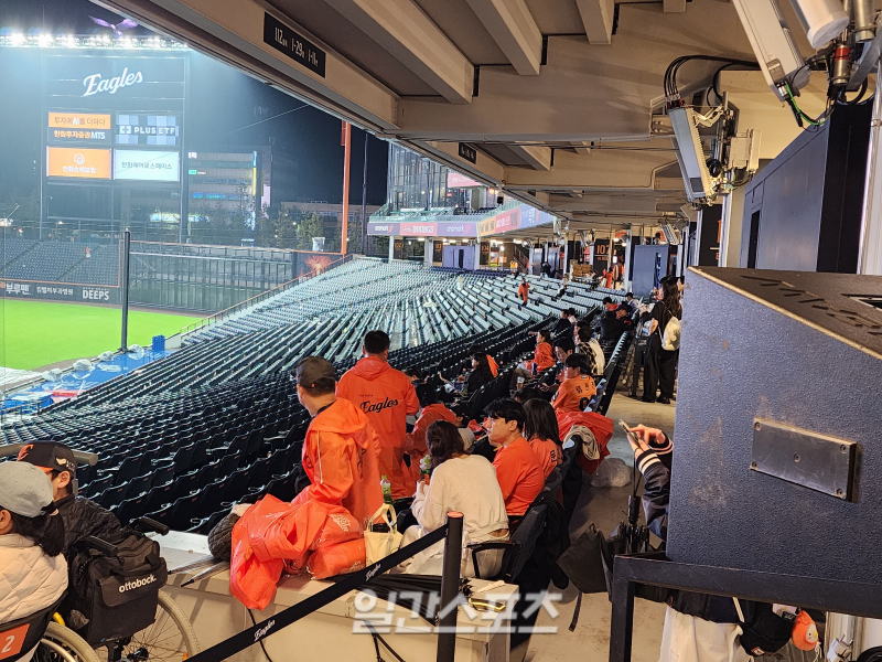 비를 피해 한화생명 볼파크 콘코스로 이동했던 팬들은 잠시 줄어든 비에 다시 좌석을 채웠다. 이런 상황에서 우천 취소 문구가 전광판에 새겨졌다. 탄식이 흘러나왔다.