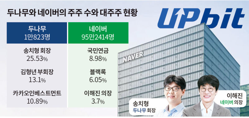 업계 관계자는 “두나무가 네이버의 자회사나 손자회사가 되면 향후 상장 시 두나무 주주 1만명이 아닌 네이버 주주 95만명이 함께 웃을 수 있는 구조가 될 것”이라고 말했다.