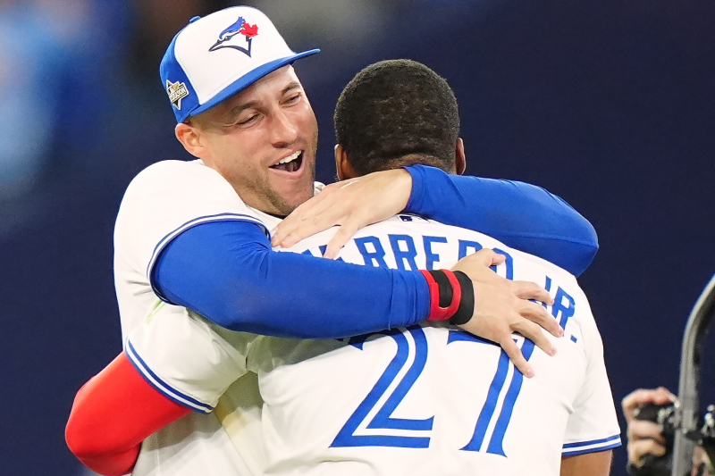 Toronto Blue Jays' George Springer, left, and Vladimir Guerrero Jr., right, celebrate after defeating the Seattle Mariners in Game 7 of baseball's American League Championship Series in Toronto, Monday, Oct. 20, 2025. (Frank Gunn/The Canadian Press via AP) MANDATORY CREDIT/2025-10-21 12:36:48/ <저작권자 ⓒ 1980-2025 ㈜연합뉴스. 무단 전재 재배포 금지, AI 학습 및 활용 금지>