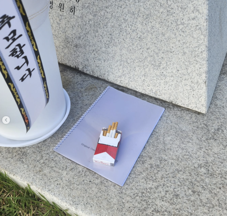 사진 속 홍경민은 고인의 묘소 앞에 스프링 제본된 책자 한 권과 담배 한 갑을 추모 화환 옆에 뒀다.
