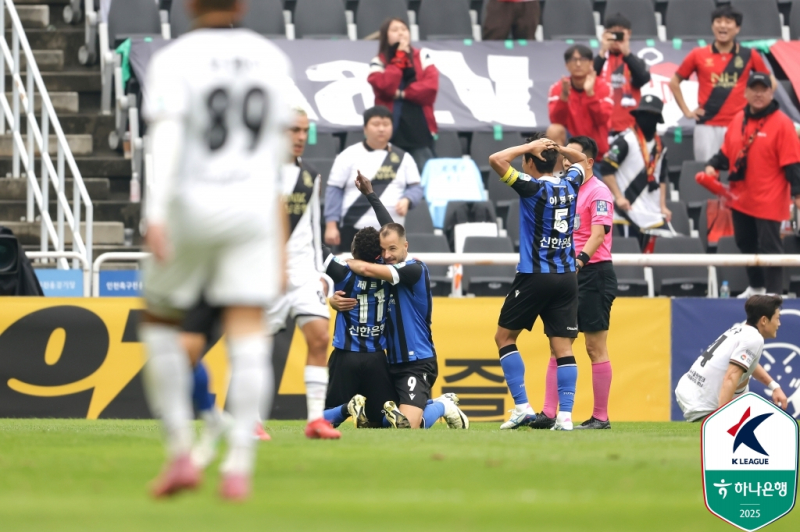 인천은 이날 승리로 정규리그 39라운드 중 36번째 경기에서 1위(23승8무5패·승점 77)를 확정했다. 전날(25일) 무승부를 거둔 2위 수원 삼성(승점 67)과 격차를 승점 10점으로 벌렸기 때문이다. K리그2 우승 팀인 인천은 다음 시즌 K리그1으로 자동 승격한다.