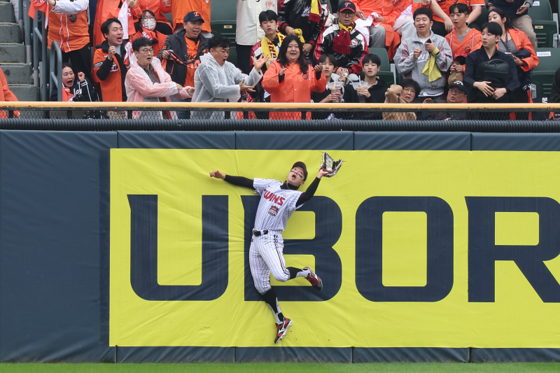 박해민은 올 시즌 한화에 공포의 대상이었다. 4월 대전 원정에서 채은성 홈런성 타구를 펜스를 밟고 날아올라 잡기도 했다. 이 외에도 최재훈과 이진영, 에스테반 플로리얼(방출) 등이 그의 호수비 희생양이었다. 박해민은 5월 27일 잠실 한화전에서는 안타 하나 없이 세 차례 호수비로 수훈 선수 인터뷰까지 했다. 그는 "한화 팬들이 저를 죽이고 싶을 거 같다"라고 웃었다. 한화 팬들은 대전 지역 유명 빵집인 '성심당'을 언급하며 '박해민, 성심당 출입 금지'라고 우스갯소리를 한다. 박해민은 "내 가치를 높여주는 극찬이라 생각한다"라며 "유독 한화전에 명장면이 많이 나왔는데 이번 한국시리즈에서도 수비에서 좋은 모습 보여드리겠다"라고 다짐했다. 호수비 펼치는 박해민 (서울=연합뉴스) 서대연 기자 = 26일 서울 잠실야구장에서 열린 2025 프로야구 한국시리즈 1차전 한화 이글스 대 LG 트윈스 경기. 1회 초 1사 1루 때 LG 중견수 박해민이 한화 문현빈의 장타를 잡고 있다. 2025.10.26 dwise@yna.co.kr/2025-10-26 14:27:27/ <저작권자 ⓒ 1980-2025 ㈜연합뉴스. 무단 전재 재배포 금지, AI 학습 및 활용 금지> 박해민은 KS 1차전 1회 말 1사 1루에서 문현빈의 장타성 타구를 멋지게 점프 캐치했다. 이 타구의 비거리는 126m였다. 박해민이 아니었다면 적시타가 될 타구였다.