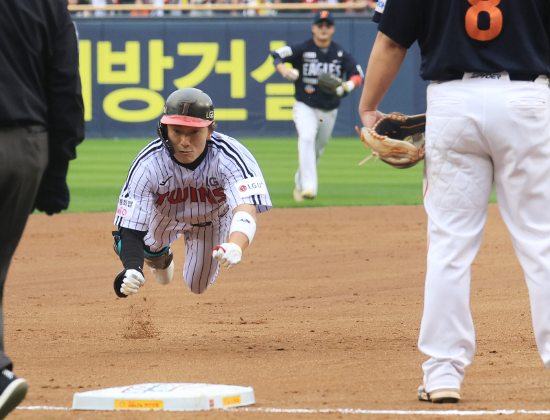 신민재는 올 시즌 LG의 우승을 이끈 주요 선수 중 한 명이다. 5월 중순까지 타율 0.191에 그쳐 2군에 다녀온 뒤 시즌 타율 0.313으로 마무리했다. 리그 타율 9위, 팀 내 1위였다. 올 시즌 강력한 2루수 골든글러브 후보로 평가받고 있다. 신민재, 날아서 3루까지 (서울=연합뉴스) 최재구 기자 = 26일 서울 잠실야구장에서 열린 2025 프로야구 한국시리즈 한화 이글스 대 LG 트윈스 1차전 경기. 5회 말 원아웃 LG 신민재가 3루 타를 날리고 3루에 슬라이딩 하고 있다. 2025.10.26 jjaeck9@yna.co.kr/2025-10-26 16:06:24/ <저작권자 ⓒ 1980-2025 ㈜연합뉴스. 무단 전재 재배포 금지, AI 학습 및 활용 금지> 특히 홍창기가 빠진 리드오프 공백을 100% 메웠다. 9월 중순 홍창기의 부상 복귀 이후 2번 타순으로 옮긴 그는 "1번이나 2번 타순의 큰 차이는 없다"라면서 "다만 9번 타순은 너무 안 오더라"고 말했다.