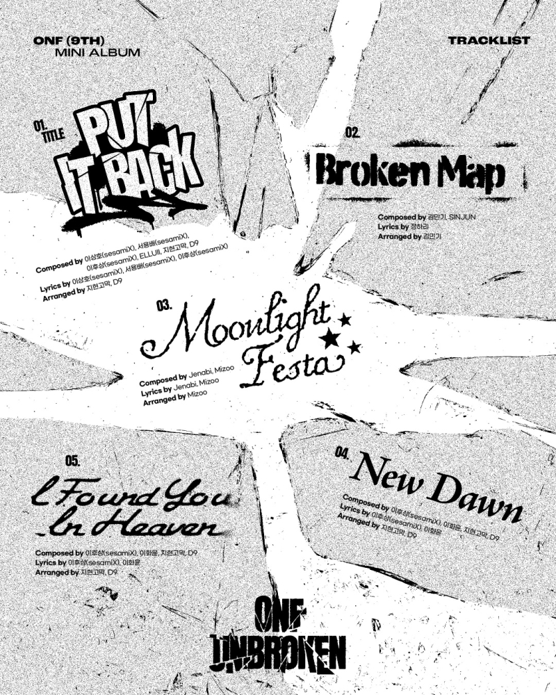 트랙리스트에 따르면 이번 미니 9집 앨범에는 타이틀 곡 ‘풋 잇 백’을 포함 ‘브로큰 맵’, ‘문라이트 페스타’, ‘뉴 던’, ‘아이 파운드 유 인 헤븐’까지 총 5곡이 수록되어 있다.