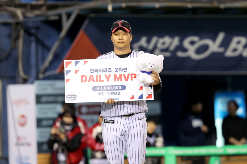 문보경은 "정규시즌 우승으로 부담감을 내려놓게 됐다. '아무리 부진해도 시즌 끝날 때까지 못 칠까'라고 싶었다"라며 "특별하게 바꾼 건 없고, 늘 하던 대로 훈련만 계속했다. 시리즈를 준비하는 동안 경기가 없어서 방망이에 대한 잡생각을 버렸고, 훈련만 했던 것이 효과가 있었다"고 돌아봤다. LG 문보경. 구단 제공 박동원은 이날 3타수 2안타(1홈런) 4타점 활약에도 문보경에게 2차전 '데일리 MVP'를 뺏겼다. 박동원은 "오늘 MVP 기념 촬영을 하는가 싶었는데 얘는 못 이기겠더라. 8할 넘게 치겠더라. 정말 잘 친다"라고 혀를 내둘렀다. 문보경의 KS 타율은 0.667(9타수 6안타 7타점)다.