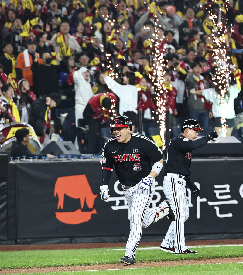 김현수, 1타점 (서울=연합뉴스) 윤동진 기자 = 26일 서울 잠실야구장에서 열린 2025 프로야구 한국시리즈 한화 이글스 대 LG 트윈스 1차전 경기. 6회 말 2사 1,2루 때 LG 김현수가 1타점 적시타를 친 후 기뻐하고 있다. 2025.10.26 mon@yna.co.kr/2025-10-26 16:19:08/ <저작권자 ⓒ 1980-2025 ㈜연합뉴스. 무단 전재 재배포 금지, AI 학습 및 활용 금지> 김현수(37·LG 트윈스)가 홈런으로 수비 실책을 만회했다.