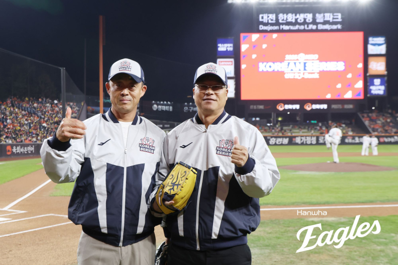 한화 이글스 구대성(오른쪽) 코치가 한국시리즈 3차전 시구자로 나섰다. 사진=한화 이글 대전 야구 '레전드' 구대성(56) 중국 장쑤성 야구팀 코치가 2025년 최종 무대를 치르는 한화 이글스 후배들에게 좋은 기운을 불어넣었다.
