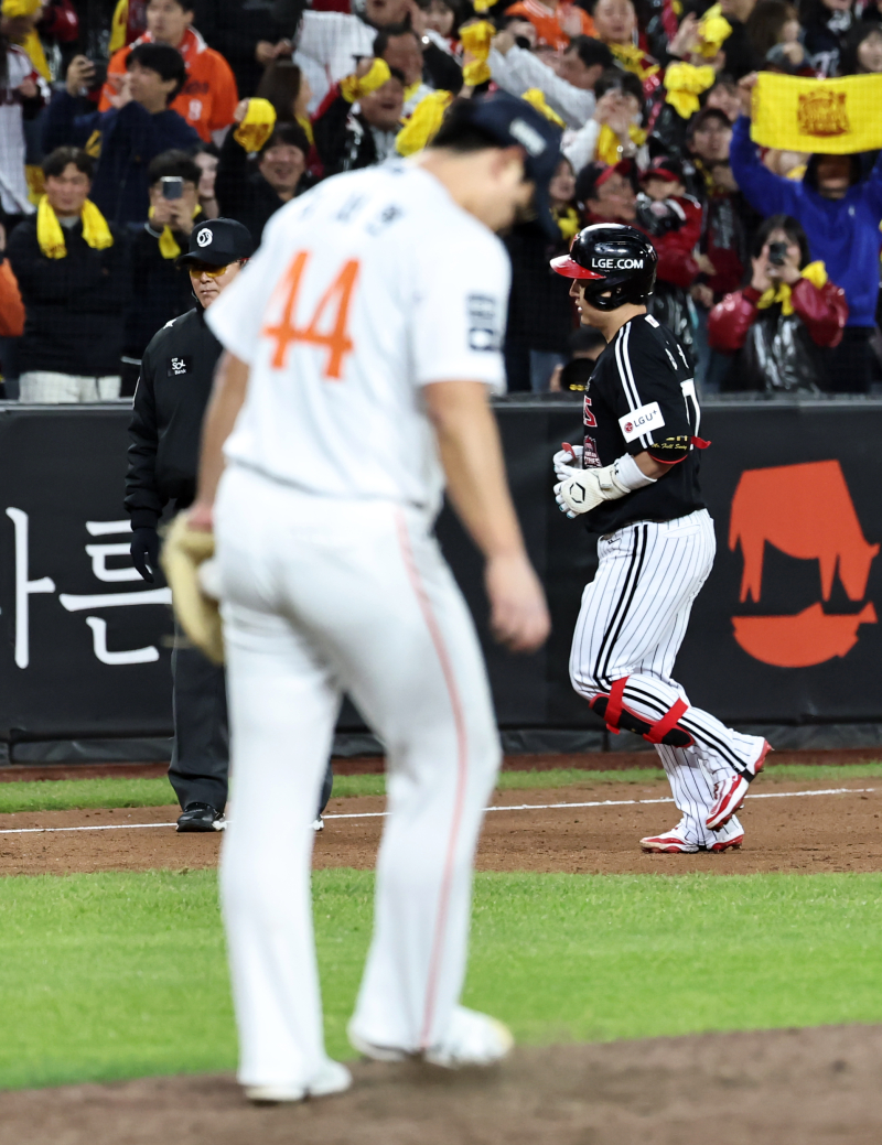 투런 홈런 친 LG 박동원 (대전=연합뉴스) 김인철 기자 = 30일 대전한화생명볼파크에서 열린 2025 프로야구 KBO리그 포스트시즌 한국시리즈 4차전 LG 트윈스와 한화 이글스의 경기. 9회초 무사 2루 LG 박동원이 중월 투런 홈런을 치고 그라운드를 돌고 있다. 2025.10.30 yatoya@yna.co.kr/2025-10-30 21:29:37/ <저작권자 ⓒ 1980-2025 ㈜연합뉴스. 무단 전재 재배포 금지, AI 학습 및 활용 금지>