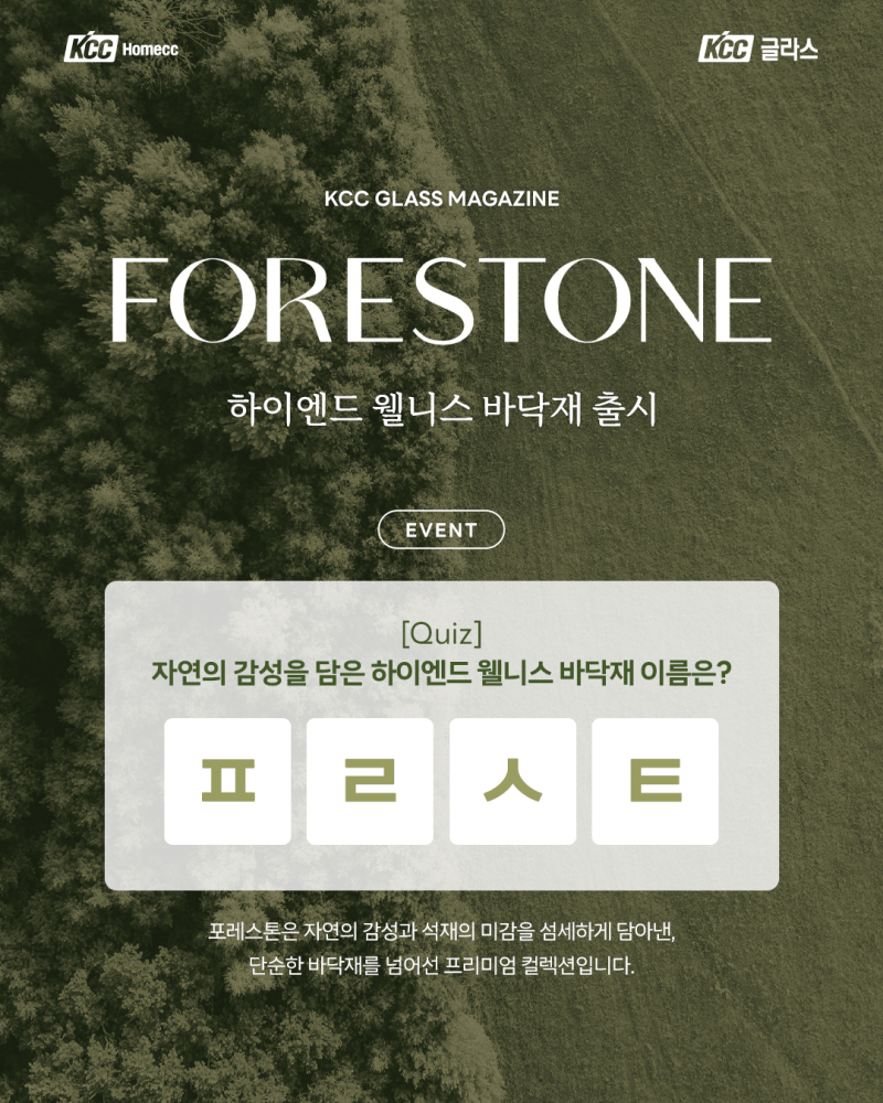 KCC글라스의 인테리어 전문 브랜드 ‘홈씨씨’는 하이엔드 웰니스 바닥재 ‘포레스톤(FORESTONE)’ 출시를 기념해 다음 달 6일까지 공식 인스타그램을 통해 퀴즈 이벤트를 진행한다고 31일 밝혔다.