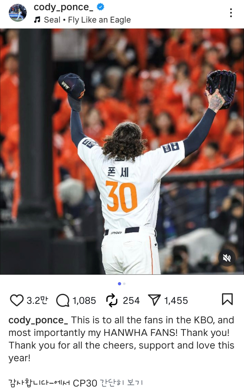 "나의 한화 팬, 감사했습니다" 폰세의 짧고 굵은 SNS 메시지, 마지막 작별 인사 될까