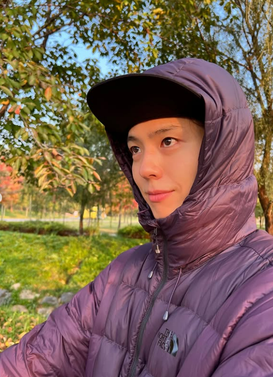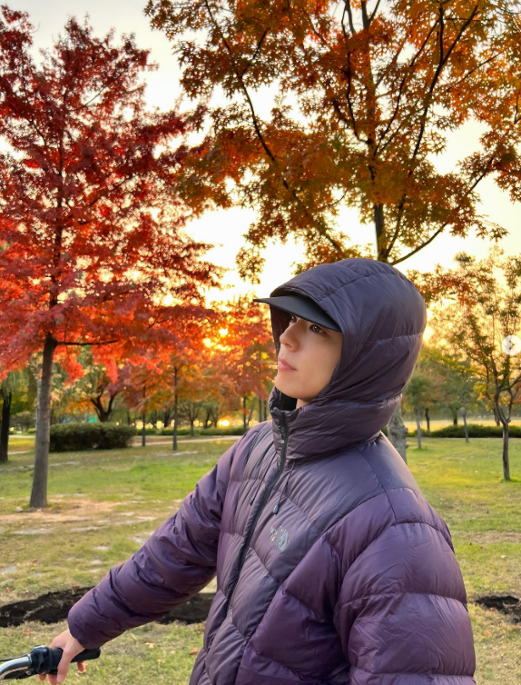 공개된 사진 속 박보검은 짙은 퍼플 컬러의 패딩을 입고 모자를 눌러쓴 채, 자전거를 타며 늦가을의 공기를 만끽하고 있다. 붉게 물든 단풍나무와 황금빛 석양이 배경으로 깔리며, 그의 부드러운 눈빛과 자연스러운 미소가 어우러져 한 편의 가을 화보를 완성했다.