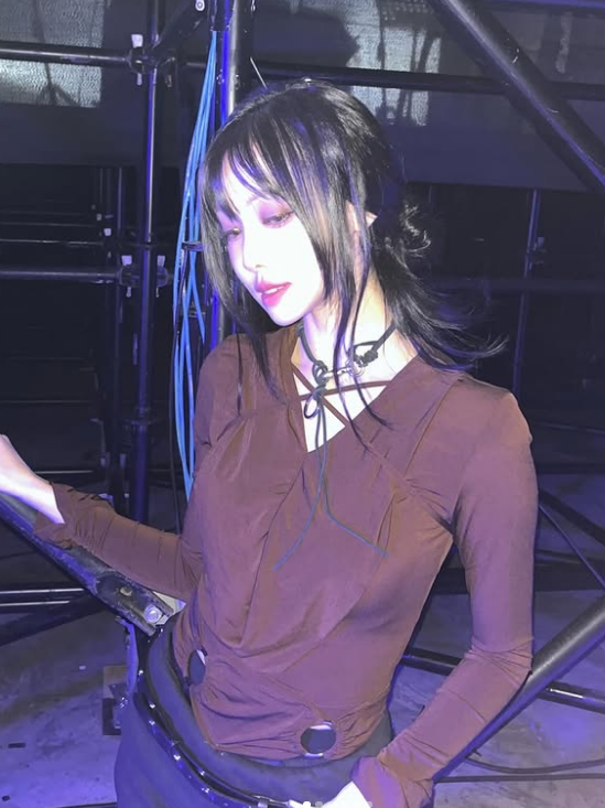 공개된 사진 속 대기실에서 그는 짙은 스모키 메이크업과 뱅 스타일의 묶음 헤어로 애니메이션 ‘체인소맨’ 속 캐릭터 레제를 현실화한 듯한 모습을 보여 눈길을 사로잡는다.