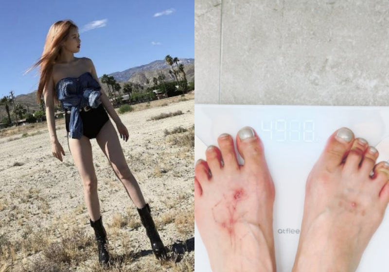 이와 함께 현아는 체중계 인증샷을 게재했다. 체중계에는 49kg란 숫자가 표시돼 있으며, 앞서 지우겠다고 선언한 발등 타두 역시 흐릿한 흔적만 남아 있다.