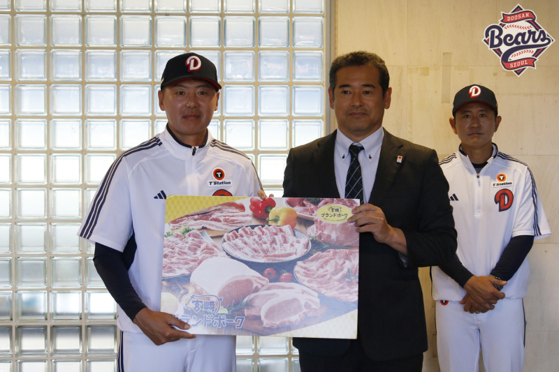 두산 베어스(사장 고영섭) 선수단이 일본 미야자키현의 고기를 선물받았다.