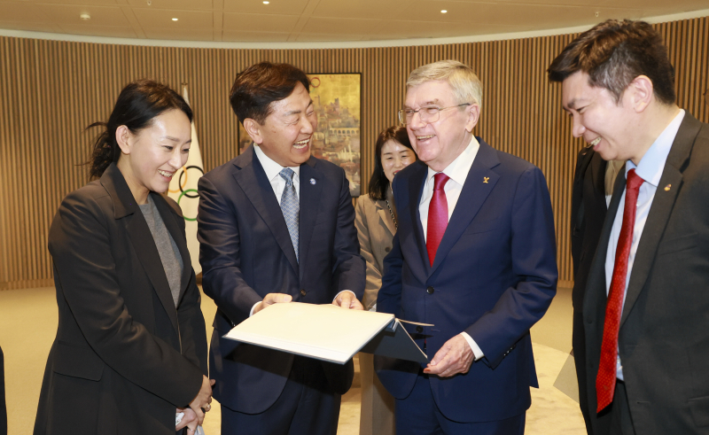 김관영 전북특별자치도지사(왼쪽 두번째)가 8일(현지시간) 스위스 로잔의 국제올림픽위원회(IOC) 본부를 방문해 토마스 바흐 IOC 위원장(오른쪽 두번째)과 대화를 나누고 있다. 2025.4.9 [연합뉴스]