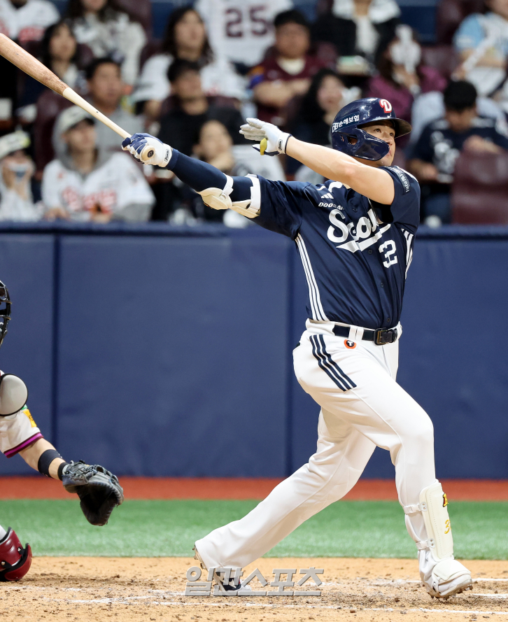 2025 KB0리그 프로야구 키움 히어로즈와 두산 베어스의 경기가 22일 오후 서울 고척스카이돔에서 열렸다. 9회초 2사 김재환이 1점차 추격하는 솔로홈런을 치고 있다. 고척=김민규 기자 /2025.04.22/