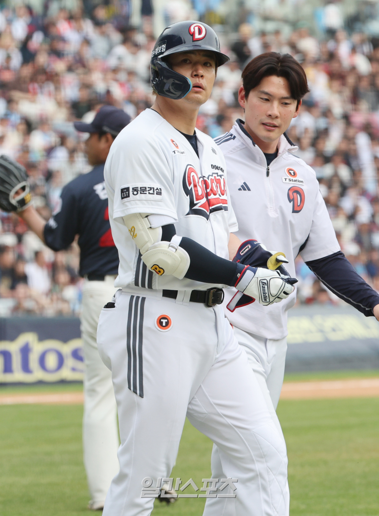 2025 KB0리그 프로야구 두산 베어스와 롯데 자이언츠의 경기가 27일 오후 서울 잠실야구장에서 열렸다. 6회말 2사 1루 김재환이 김상수의 공에 맞고 불만을 표시하며 1루로 나가고 있다. 잠실=김민규 기자 /2025.04.27/