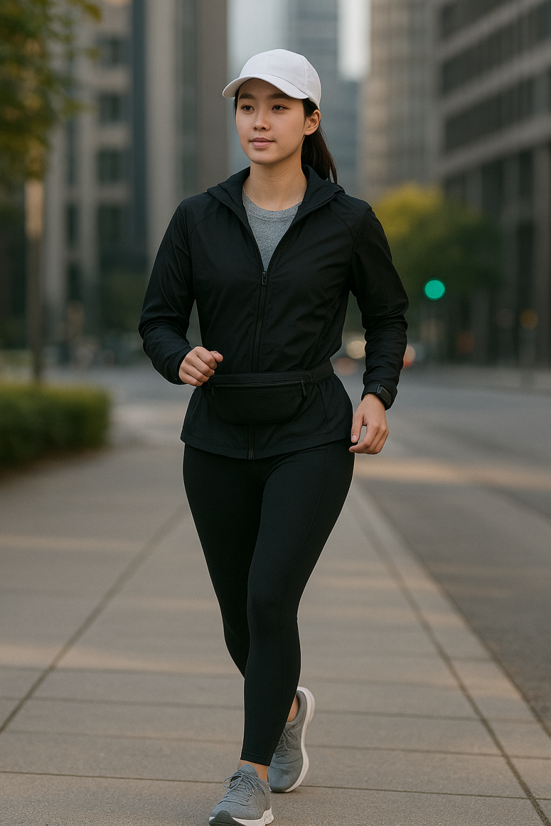🍂 초겨울 러닝룩 (10~15℃) 상의: 기능성 롱슬리브 + 바람막이 하의: 기모 러닝 타이츠 or 롱 레깅스 신발: 쿠션형 러닝화 + 기능성 양말 액세서리: 경량 장갑, 이어워머 🖤 예시 코디: 차콜 롱슬리브 + 블랙 방풍자켓 + 블랙 타이츠 + 화이트 신발