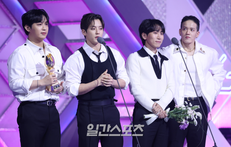 그룹 비투비가 '베스트 보컬'상을 수상하고 소감을 말하고 있다.