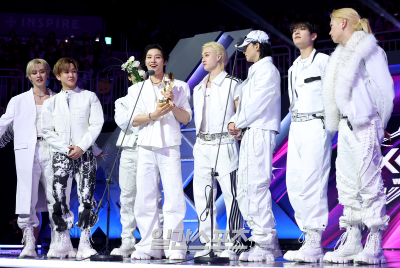 뮤직데이 최고인기상을 수상한 스트레이키즈가 수상소감을 말하고 있다.