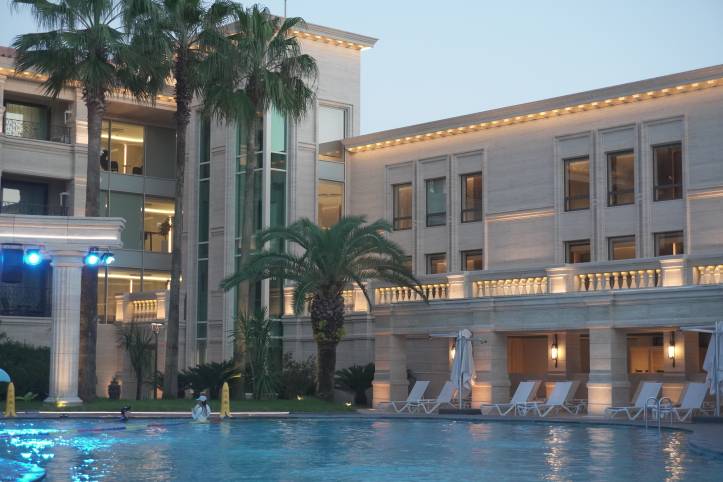 해질 무렵의 야외 온수풀.크리스마스 장식으로 꾸며진 더 시에나 리조트 메인 정원. 더 시에나 그룹 제공 저녁에는 수영장 건물 외벽에 영화 같은 미디어파사드 영상이 상영되며 미니 콘서트가 함께 열린다. 홈페이지에서 객실 예약 시에는 더 시에나 프리모뿐만 아니라 더 시에나 리조트에 위치한 풀까지 모두 이용 가능한 혜택이 제공된다. 더 시에나 리조트에는 성인만 입장 가능한 인피니티풀이 있으며, 아래에는 아이들과 함께 이용 가능한 수영장이 위치해 있다.