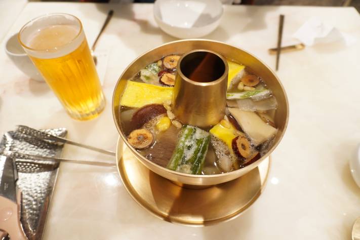 이탈리아 대저택을 연상케 하는 더 시에나 리조트를 한 바퀴 산책하는 것도 이번 키캉스의 필수 코스다. 특히 리조트는 연말을 맞아 메인 정원과 실내를 크리스마스 분위기로 단장하며 특별한 계절 분위기가 느껴진다. 호텔 내부 곳곳에 흰 눈이 소복히 쌓인 듯한 트리들이 연말이 다가옴을 알려주는 듯하다. 또 정원의 대형 트리는 대낮에는 건축미와 더해져 이국적인 분위기를 자아내고, 해질녘 점등 후에는 추워진 겨울을 따뜻하게 밝혀주니 두 번의 방문이 필수다. 까보스코 레스토랑 디너 코스 까보스코 레스토랑 디너 코스에 포함된 신선로. 아이까지 생각한 럭셔리 '한식 파인 다이닝'