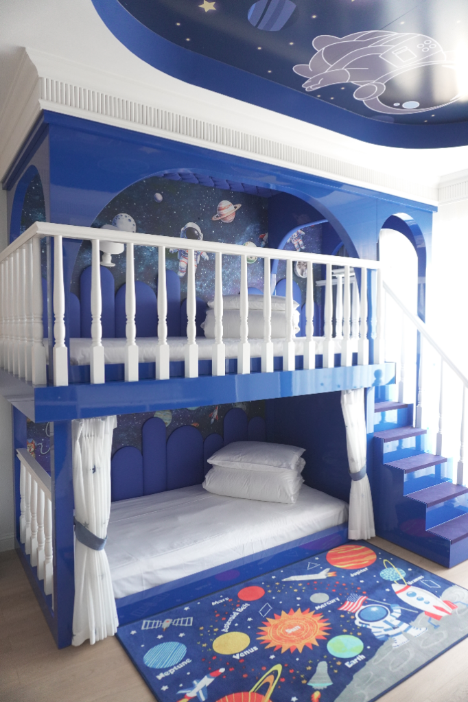 이날은 ‘키즈 스위트 블루’ 객실에 투숙했다. 스위트 객실은 키즈동이 아닌 본관에 위치해 있으며, 주차장이나 야외 수영장과의 접근성이 매우 높았다. 키즈룸은 우주를 향한 모험을 테마로 깊고 신비로운 조명, 로켓 및 행성 오브제로 가득했다. 아이가 2층 침대에 오르면 우주 탐험이 시작될 듯한 분위기를 연출한 것이 특별했다.