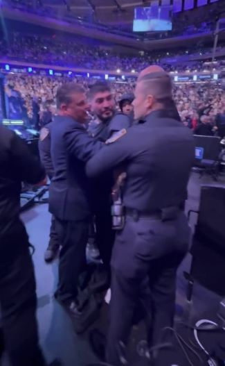 딜런 데니스가 UFC 322에서 난투극을 벌인 뒤 보안요원에게 잡혀 있는 모습. 사진=MMA 정키 X MMA 프로 선수인 데니스의 ‘UFC 진출’ 꿈도 무산된 셈이다. 아직 선수로는 UFC에 입성한 적이 없는 데니스는 옥타곤에서 싸우고 싶어 했다.