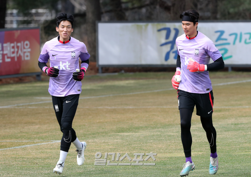 골키퍼 김승규와 송범근이 22일 오전 경기도 파주트레이닝센터(NFC)에서 진행한 대표팀 훈련에서 런닝으로 몸을 풀고 있다. 대표팀은 이날 오전 훈련 후 평가전이 열리는 울산으로 이동한다. 파주=김민규 기자 mgkim1@edaily.co.kr /2023.03.22/ 연령별 대표팀을 두루 거친 송범근은 올 시즌 전북으로 복귀해 K리그1 정상 등극에 크게 이바지했다. 전북에서 나선 리그 36경기 중 14경기에서 클린시트를 기록했다. 이번 시즌 조현우를 제치고 K리그1 베스트11에 오를 것으로 전망된다.