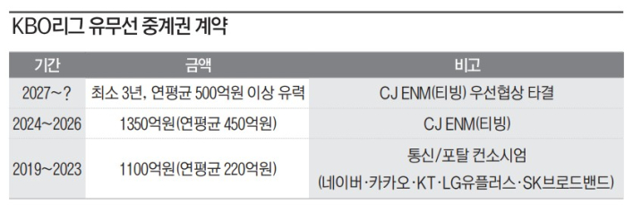 KBO는 지난 18일 'KBO리그 유무선 중계권과 관련해 기존 중계권사 CJ ENM과 차기 계약에 대한 우선협상을 타결했다'고 밝혔다. CJ ENM은 지난해 3월 총액 1350억 원(3년·연평균 450억 원) 규모의 계약으로 KBO리그 유무선 중계권을 확보한 바 있다. 당초 2026시즌까지 권리를 행사할 수 있었으나, 이번 우선협상 타결로 기간이 추가로 연장될 전망이다.