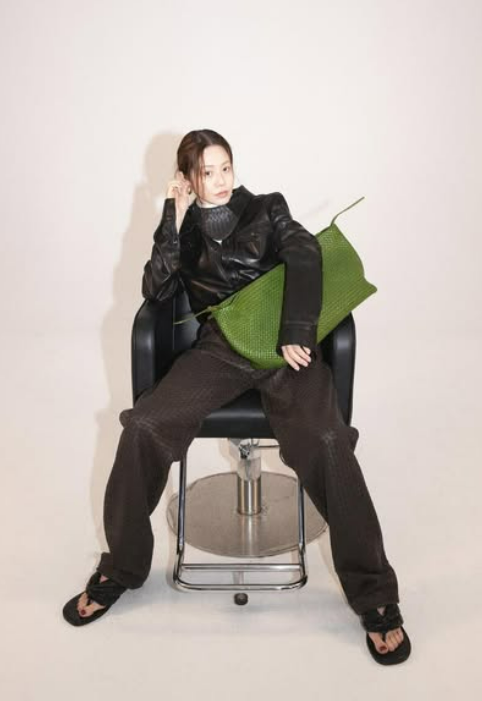 의자에 앉아 정면을 응시하는 전신 사진에서는 압도적인 카리스마가 느껴진다. 블랙 가죽 재킷과 와이드한 브라운 계열 하의를 매치해 시크한 매력을 극대화했으며, 특히 비비드한 그린 컬러의 가방을 포인트로 들어 강렬한 인상을 남겼다. 군살 없이 탄탄한 몸매와 패셔니스타다운 감각이 돋보인다.
