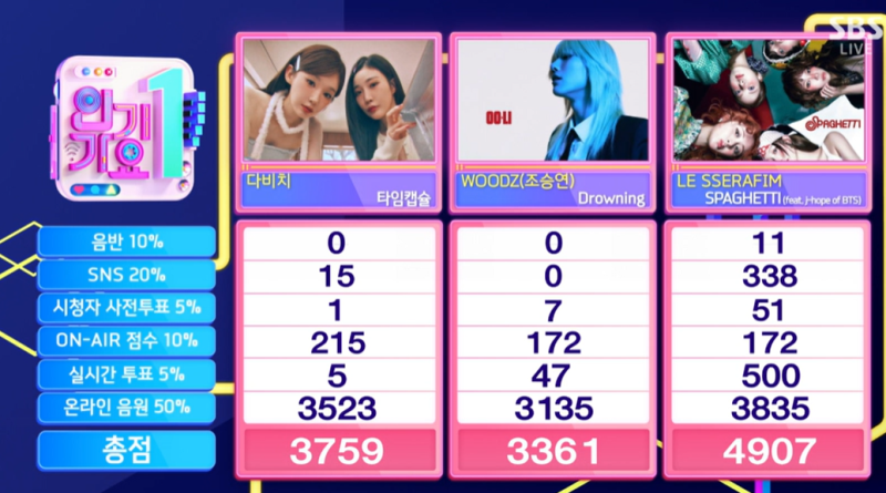 르세라핌은 23일 방송된 SBS 음악 프로그램 ‘인기가요’ 1위 후보로 오른 다비치 ‘타임캡슐’, 우즈 ‘드라우닝’을 제치고 ‘스파게티(feat.제이홉 of BTS)’으로 1위에 올랐다.