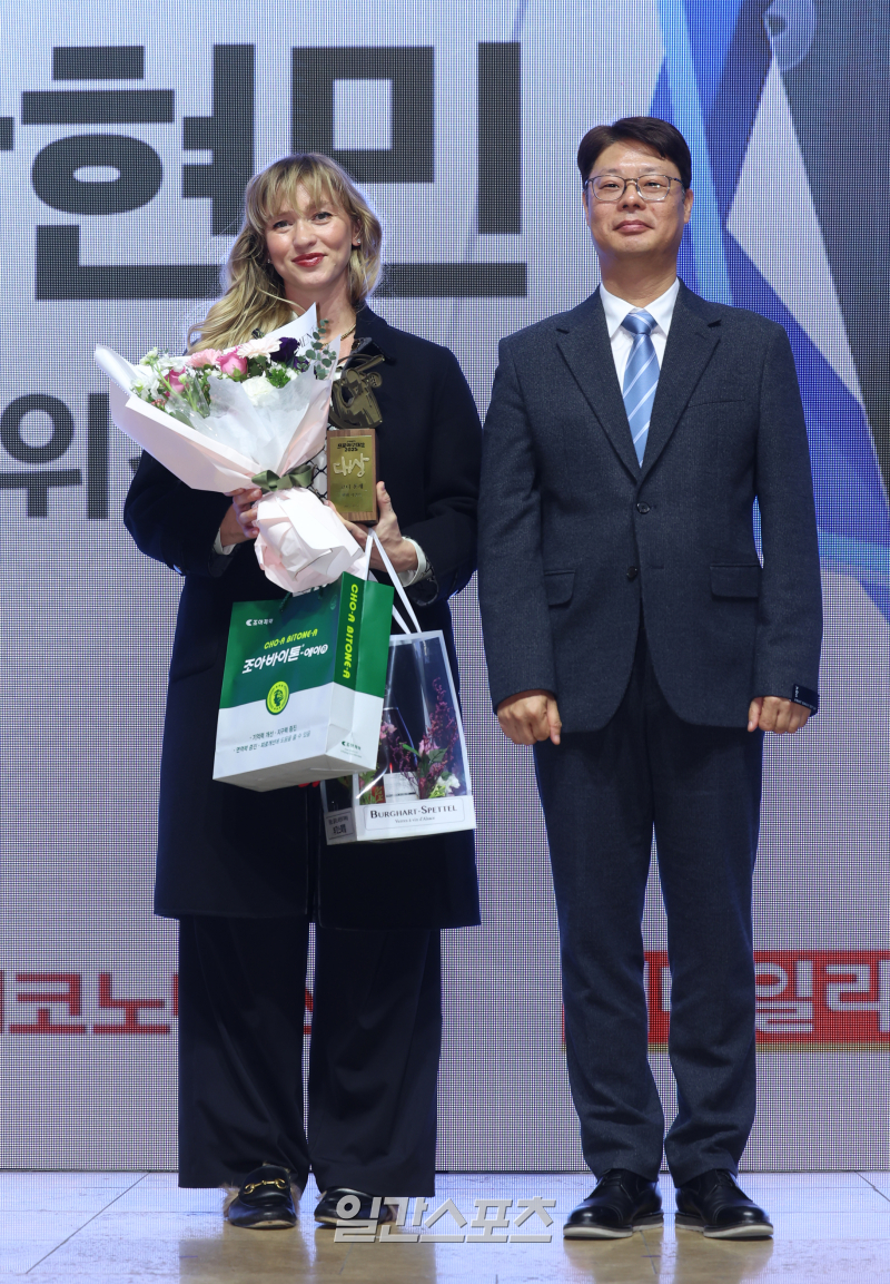 한화 폰세의 부인 엠마 폰세가 대상을 수상하고 조성배 조아제약 대표이사와 함께 기념촬영을 하고 있다.